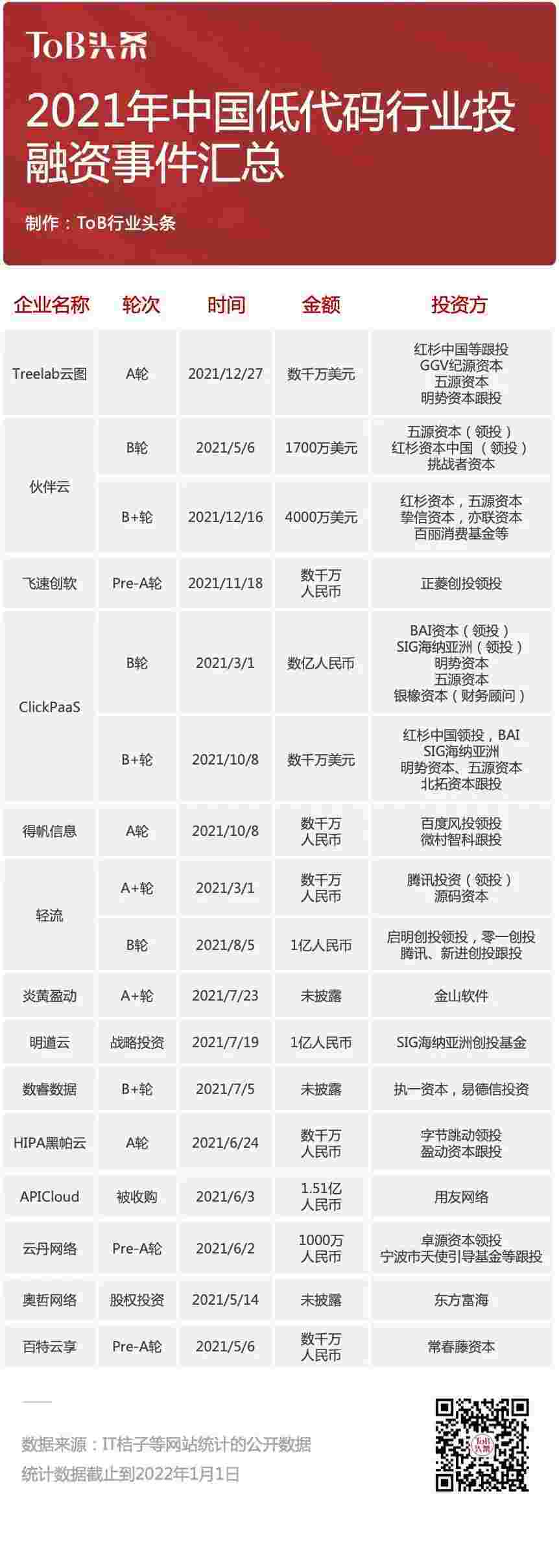 到2021年,,,无/低代码投融资规模势头更甚,,其中包括轻流两轮融资(A+轮数千万人民币,,,,B轮近亿人民币)、、VIVO钱包 两轮融资(B轮数亿人民币,,,B+轮数千万美元)、、百特云享数千万元Pre-A轮融资......